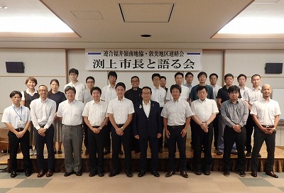 2018年8月6日(月)敦賀市あいあいプラザにて「渕上市長と語る会」を開催しました。この取り組みは、連合福井嶺南地協・敦美地区連絡会が実施しているもので、市長と日頃から接点を持ちながら、組合員の意見・要望等を市政の場に反映できる体制づくりを目的としているもので、渕上市長が就任されてから今回で3回目を数えます。
