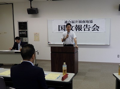 2019年6月29日(土)、美浜町「はあとぴあ」にて、斉木武志衆議院議員からの「国政報告会」を開催しました。昨年11月に初めて開催し、今回が2回目の報告会となりました。6月26日に通常国会が閉会してすぐの開催ということで、ホットなニュースを含めて報告を受けるとともに、参加者からは意見や質問、要望など幅広い分野で様々な観点での発言があり、充実した意見交換も行うことができました。