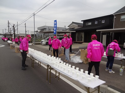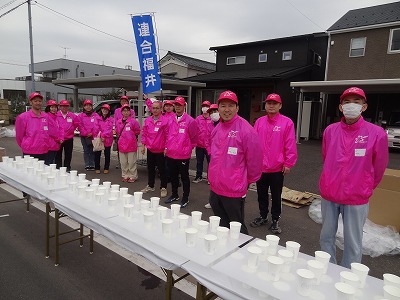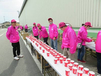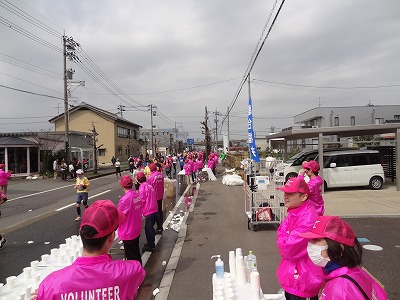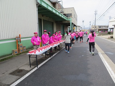 当日は給水所を担当し、福井地区連絡会は福井市・川端製紙(株)周辺で、坂井地区連絡会は坂井市・松岡満運輸(株)周辺でスポーツドリンクやお水を振る舞いました。初開催にも関わらず、1万人を超えるランナーが参加したとのことで給水所も慌ただしかったですが、次々と来るランナーに「頑張れ!」、「ファイト!」などと声を掛けてエールも送っていました。