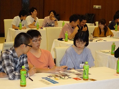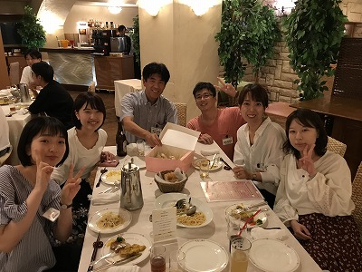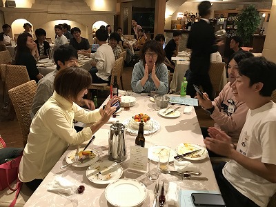 そして、17時30分からは8Fレストラン「イル・ヴィゴーレ」に会場を移し、交流懇親会を行いました。第1部のカードゲームで話し合いを繰り返した効果か、各テーブルとも和気あいあいとアルコールも入る中、みなさん楽しい時間を過ごされていました。