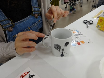 最初にたくさんの種類の転写紙の中から各自好きなものを選んでもらい、講師の斉藤先生の説明を受けて、制作スタート。水に浸して、転写部分が剥がれたら、白磁にしっかりと貼り付けていきます。