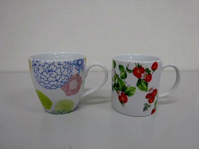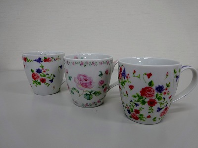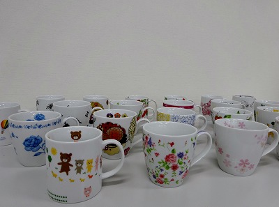 様々なデザインのマグカップが出来上がりました。同じ転写紙を使用しても、全く違った作品ができる面白さがあります。この後、専用の電気炉で焼成し完成となります。