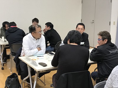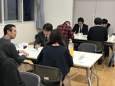 4名1グループに分かれ、15分に1回グループを交代して「会社と組合の好きなところ・嫌いなところ」をテーマに行いました。交代の時間を過ぎても参加者の会話が続くほど盛り上がり、初めての異業種交流会「ワールドカフェ」は成功裏に終えることができました。また、終了後には懇親会も行い交流を更に深めることができました。