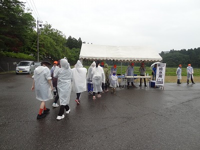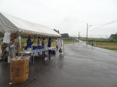 当日はあいにくの天候になりましたが、㈱ニットク前で参加者にポカリスエットや水を配る給水所を担当しました。