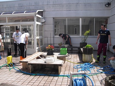 【中庭のタイル掃除】
