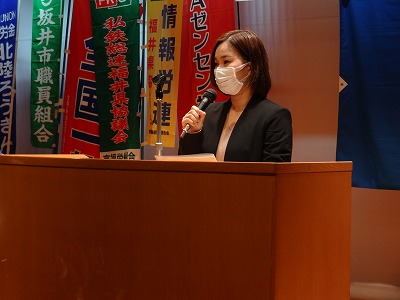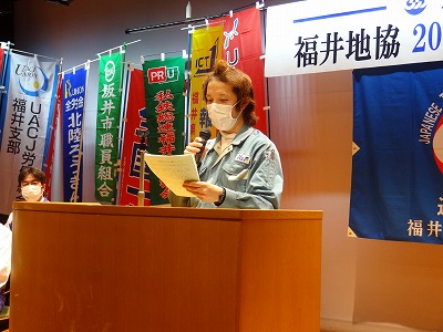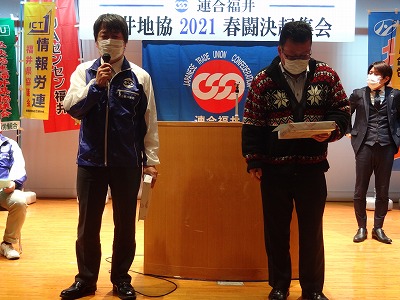 激励の挨拶をいただいた連合福井の橋岡副会長は、これまでの取り組みの中で、県内の企業は製造業などを中心とした第2次産業が多く、コロナによる影響は少なく、経営者は先行きが見通せない中、利益を内部留保に回していると聞いている。コロナ禍だから厳しいと終わらせず、労働組合として、しっかりと経営状況を追及して欲しい。賃金は労働の対価で、経済や生活基盤を支えるための重要な財源でもあり、「底上げ」「底支え」「格差是正」に取り組んでほしい。一方で、コロナ禍で働くエッセンシャルワーカーの方々にご尽力いただいているが、組合員が安心して働くためにも労働組合の役割としてセーフティネットを果たしてほしい。と連合福井への連帯を呼びかけました。