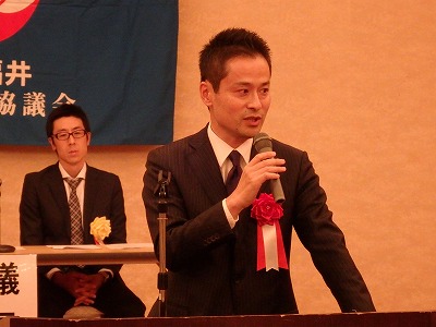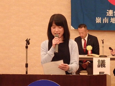 ↑ 第3号議案が拍手で採択された後、候補予定者からご挨拶