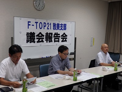 2019年8月5日(月)、敦賀市あいあいプラザにおいて議会報告会を開催しました。この取り組みは、嶺南地協敦美地区連絡会とF-TOP21敦美支部の共催により実施しているものです。嶺南地協推薦議員から県政・市政の報告を受けるとともに意見交換を行い、相互の課題等を共有し、私たち働く者の声・生活者の声を推薦議員を通じて県政や市政に反映していくことを目的としています。