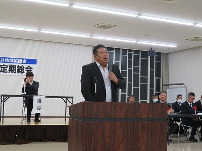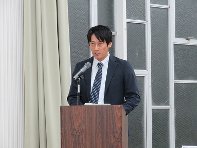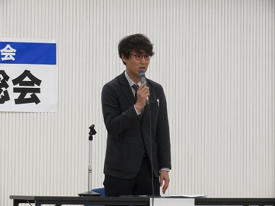 冒頭、福井市長選挙への立候補を表明しており福井地協でも推薦を確認した「西行しげる」氏が、推薦への感謝と市長選挙への決意を述べました。
