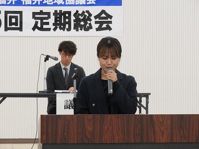 総会議長には、向出代議員を選出し議事が進められ、2023年度活動報告・決算報告が代議員の拍手で承認されました。続いて、第1号議案「2024年度活動方針(案)」から第4号議案「役員改選および退任役員表彰」まで全ての議案が可決されました。