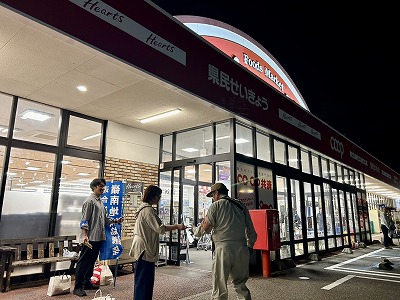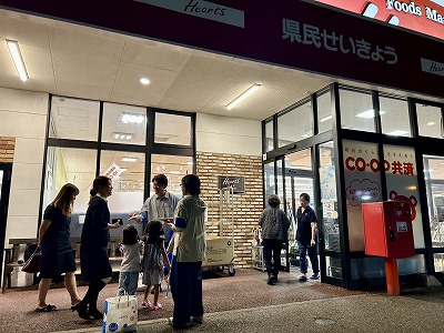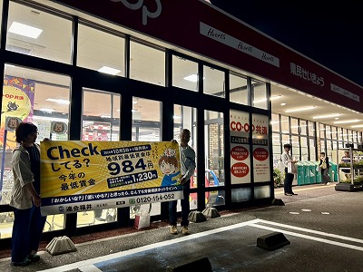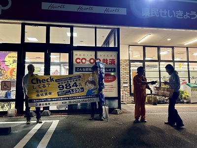 ▲ハーツつるが正面入口にてウェットティッシュを配布しました。