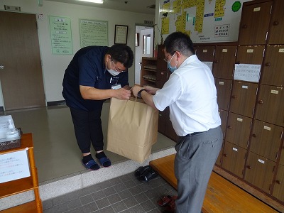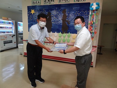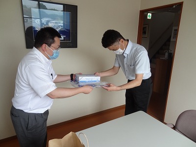 支援物資の「フェイスシールド」「プラスティックグローブ」が準備できたことから、7月15日(水)、松浦議長と5施設へ訪問。物資を贈呈しました。