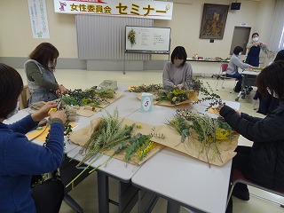 2月27日(土)ユニオンプラザ福井にて2021第1回女性セミナー「空間をおしゃれに変えてくれる スワッグ作り」が開催され、40名の方が参加されました。講師に勝山市の三姉妹のお花屋さんhiromiから、松田瑞恵さん、黒田ひかるさんをお迎えしました。
