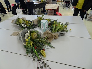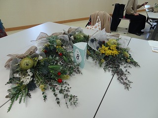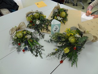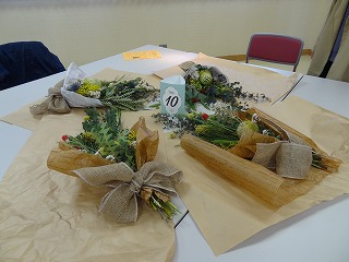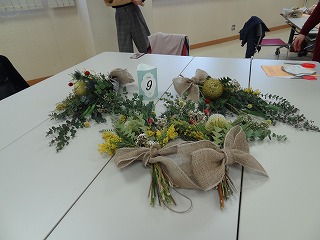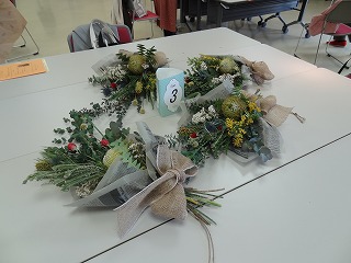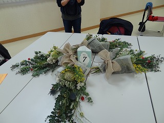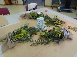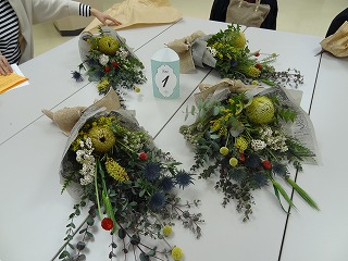 作り方としましては、ユーカリを軸として50㎝の長さに切り、花材の茎を交互に重ね合わせながら、ティアドロップ(涙のしずく)の形になるように、手前に短い花材を組み合わせていきます。バランスよく茎の向きや配置を考えていくのが難しく、講師の方にアドバイスをいただいたり、手を加えてくださったりすることで仕上げていき、朝の布のリボンを結び仕上げていきました。各々のテーブルで、黙々と作業を進めていき、作品が出来上がるころには、マスクの下の顔が笑顔になっていくのがわかりました。同じ材料でもそれぞれの個性が出たスワッグが出来上がったようです。家に持ち帰った後、ドライフラワーに変わっていく過程も楽しみたいと思います。
