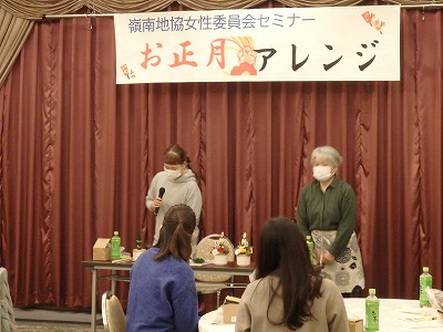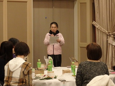 今回の女性セミナーでは、「お正月アレンジ」というテーマで「たかい生花園」の伊原ゆかりさんと高井真澄さんに、プリザーブドフラワーを使った正月飾り教室をしていただきました。各産別・単組から26名の参加をいただきました。