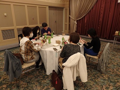 バラのプリザーブドフラワーを中心に、松の枝やコチョウラン(造花)などの配置について、参加者の方々は試行錯誤しながら、お手本や講師の先生のアドバイスを元に和気あいあいと作業に取組まれていました。