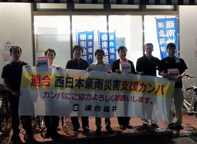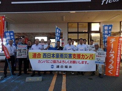 今回の行動は、西日本を中心とした豪雨災害に対する支援の一環として実施したものです。連合では、7月9日に「西日本豪雨災害情報センター」を開設し、各地方連合会・構成組織からの情報収集を行うとともに、必要な支援活動を行っています。そうした中、連合福井嶺南地協管内においても9月5日・6日の二日間、協力店舗の一角をお借りしてカンパ活動を行いました。