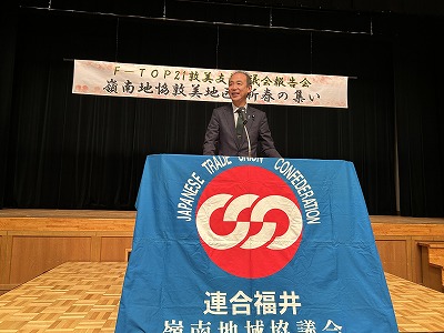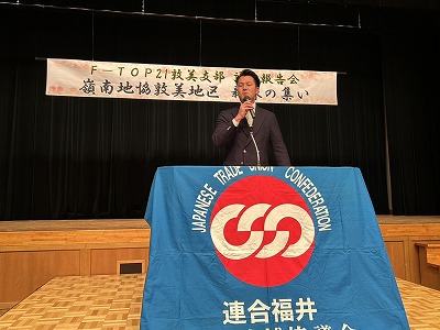 敦賀市、推薦議員団、労福協、北陸労金、こくみん共済coopなど労働福祉事業団体にお越しいただき、また構成組織・加盟組合から多くの役員・組合員にご参集いただき盛大に開催することができました。また、衆議院議員の辻英之氏も駆けつけていただき、敦美地区管内の自治体首長及び北川県議からもお祝いのメッセージをいただきました。