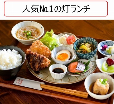 カフェでは、地元食材をふんだんに使用した「灯ランチ(税込1300円)」がおすすめで(現人気No.1!!)焼物、揚物、汁物、副菜、プチデザートなどが小鉢になってるランチで女性にとても人気があります。