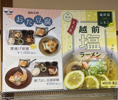 レモンが入りさっぱりとした「越前塩ラーメン」、越前町の特産品「おたとうふ」を使用した「厚揚げ御膳」、「揚げ出し豆腐御膳」がおすすめされていました。
