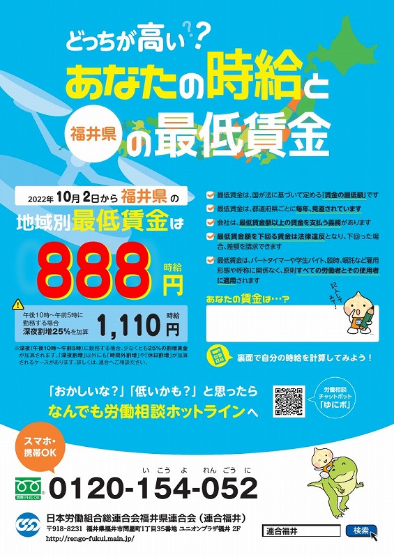 福井県地域別最低賃金「888円」に!~10月2日発効~