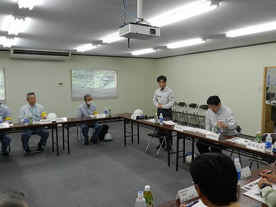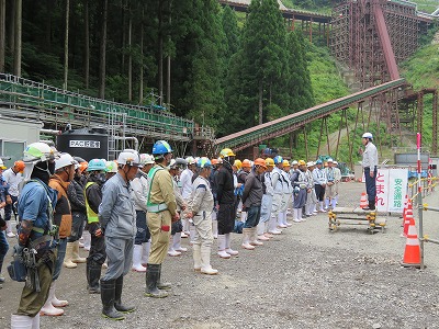パトロールに入る前に工事概要や作業概要等について、施工者である清水・大林特定建設工事共同企業体の担当者から説明を受けた後、特別朝礼が行われました。特別朝礼では福井労働局の石川局長からの訓示および労使団体それぞれから挨拶を述べ、日頃の安全衛生の取り組みや治水対策・防災・減災という点で重要な役割を果たすダム工事に携わられている従事者に敬意を表しました。