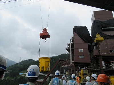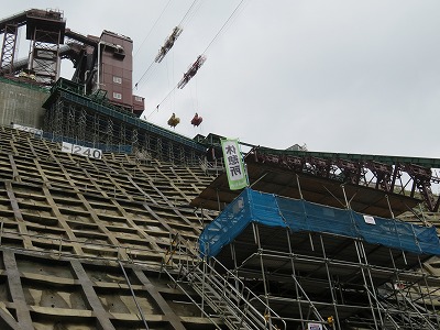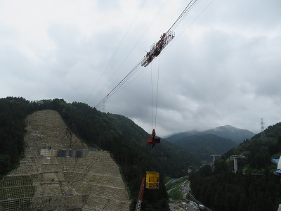 ▲セメントサイロから吊ケーブルクレーンで現場までコンクリートを運搬