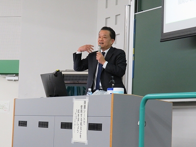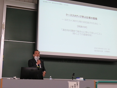 講義の中で矢野会長は、働くうえで自分が何を大切にしたいかを投げ掛けてから、自身の経験を交えて就活での会社選びのポイントなどを説明していきました。