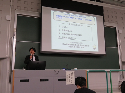 2023年4月19日、第2回の講師を橋岡事務局長が務め、学生にとってどういう組織かイメージしにくい「労働組合」について講義しました。