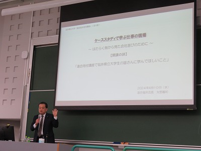 2024年4月10日、今年で12年目を迎えた「福井県立大学経済学部 連合福井寄付講座」が開講し、講師を矢野会長が担当しました。