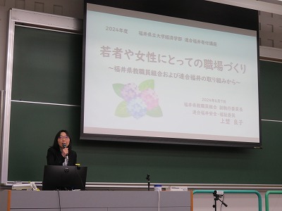 2024年4月24日、県教組 上埜副執行委員長が第3回の寄付講座を担当し、組合として若者や女性に対してどのようなサポートをしているかを講義しました。