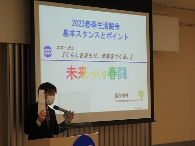 「未来づくり春闘」を掲げて闘争を進める中、今年の春闘の背景にはどのような課題があり何に問題意識を持った闘争方針案となっているのか。また、足元の労働者の暮らしを守ると同時に、賃金も物価もGDPも安定的に上昇する姿へと経済のステージを変えていく。そのターニングポイントが2023春闘となることなど、基本的な考え方などを改めて共有しました。