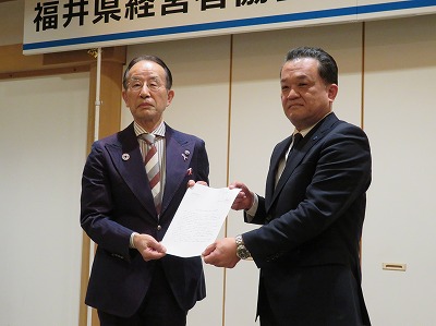▲連合福井 矢野会長(右)から経営者協会 光野会長(左)へ要請書提出