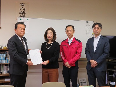 ▲矢野会長(左)から山内代表理事、水島代表理事、大澤副代表理事(左から)に要請書を提出