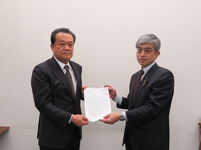 ▲矢野会長(左)から江端専務理事(右)に要請書を提出