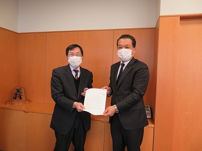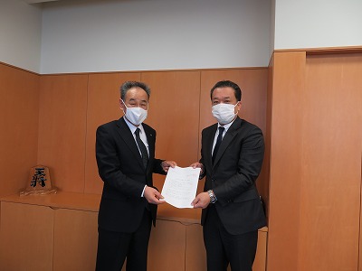 ▲矢野会長(右)から市長会の清水事務局長(左)へ要請書提出