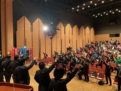 ▲締めは、矢野会長の発声による力強いガンバロー三唱で