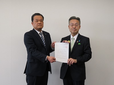 ▲矢野会長(左)から杉本知事(右)へ要請書提出