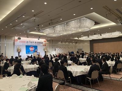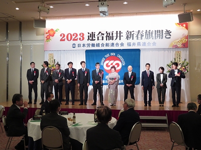 1月6日(金)に福井市グランユアーズフクイにて、連合福井新春旗開きを開催しました。来賓には、杉本福井県知事をはじめ、行政・経済界、労働福祉事業団体、推薦議員など多くの方にご臨席いただき、構成組織・加盟組合役員と合わせて総勢180.名が一堂に会しました。