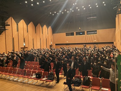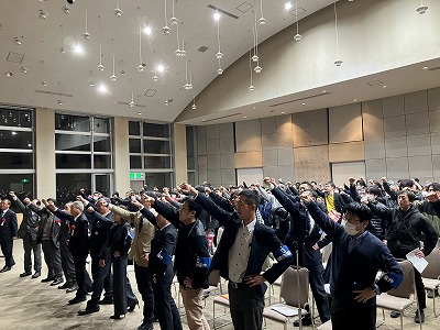 ▲集会の最後は矢野会長の発声により力強いガンバロー三唱で締めくくりました。