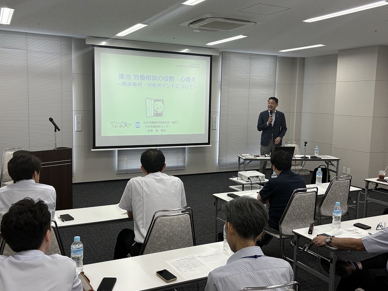 研修会は2部構成となっており、第1部では講師として連合中央労働相談センターから森局長にお越しいただき、「連合 労働相談の役割・心構え~相談事例・対処ポイントについて~」というテーマで、連合としての労働相談対応や労働相談で留意しておくべき内容について、ご説明をいただきました。