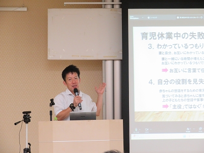 講師には、数年前に男性の育児休業取得促進に向けた学習会で講師にお招きしたこともある、NPO法人「おっとふぁーざー」の代表理事を務められている「舘直宏」さんにお願いし、「育児休業取得の心構え」と題してご講演をいただきました。