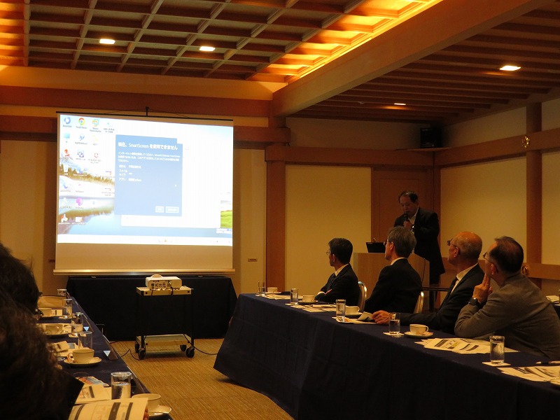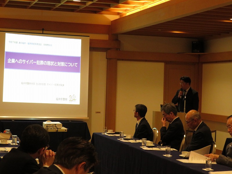 労使懇談会の後には講演会も行いました。今回は福井県警察本部から講師を迎え、県内でも増加する特殊詐欺被害や企業へのサイバー攻撃をテーマに、「企業を狙ったサイバー犯罪の現状と対策」「特殊詐欺の現状と被害防止」と題した講話を受けました。
