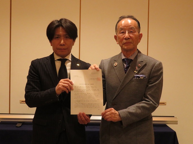 ▲連合福井 橋岡会長(左)から福井県経営者協会 光野会長(右)へ要請書提出